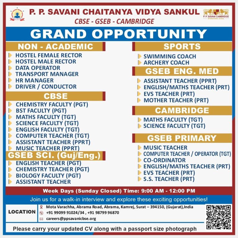 GSEB English Medium CBSE GSEB Primary Admin Department Grade-IV GSEB English Medium 1. Mother Teacher (Pre-Primary & Primary)2. Assistant Teacher (Pre-Primary & Primary) CBSE 1. Assistant Teacher (Pre-Primary & Primary)2. Music Teacher3. PGT Coordinator GSEB Primary 1. Sanskrit Teacher Admin Department 1. Persoanl Assistant Grade-IV 1. Electrician2. Plumber3. Driver4. Conductor5. Lift Helper (Male & Female)6. Security Guard7. Peon8. Sweepers/Cleaning Staff